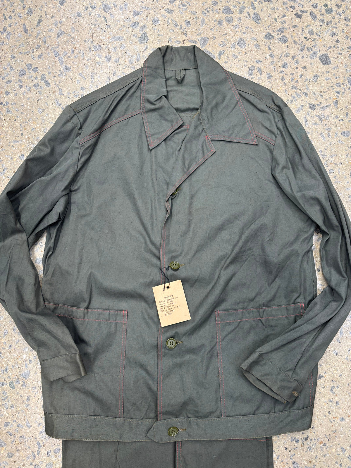 They feature the Gost number 12548-76 which refers to: "Occupational safety standards system. Special clothing to protect against mechanical damage and general industrial pollution. Mens suits." So, workmans wear.
