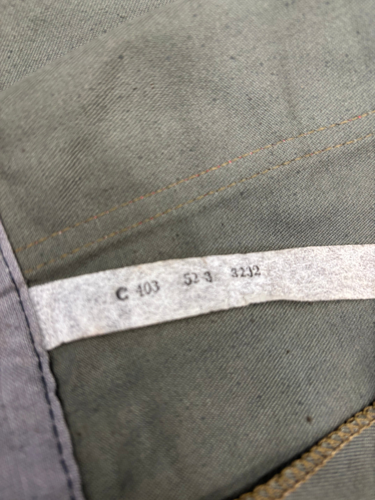 Model is apparently C403. The jacket features four buttons on the front, two open topped lower chest pockets, and no sleeve or internal pockets. The matching trousers feature a total of three pockets, two side pockets and one on the seat.