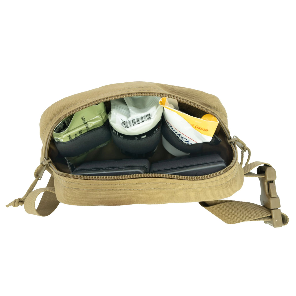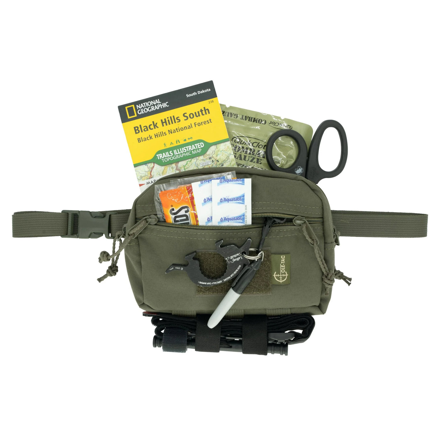 Cole-Tac carefully crafted the SERE Sack’s many unique organizational features. The main compartment holds 2.5 liters of supplies and offers internal Velcro loop panels on both sides, perfect for organizers or dividers. The MOLLE-compatible webbing on the bottom allows users to attach additional accessories that do not fit in the main compartment or front zip pocket. A front Velcro loop patch on the front can be used to secure signal lights, IR blinkers, and ranger eyes. In addition, the adjustable waist strap clips firmly in place, and the internal key retainer in the front pocket ensures you never launch your keys into the mud or snow again.