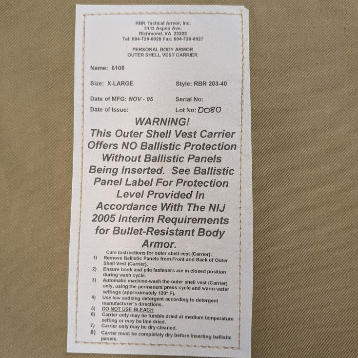 Personal Body Armor Outer Shell Carrier